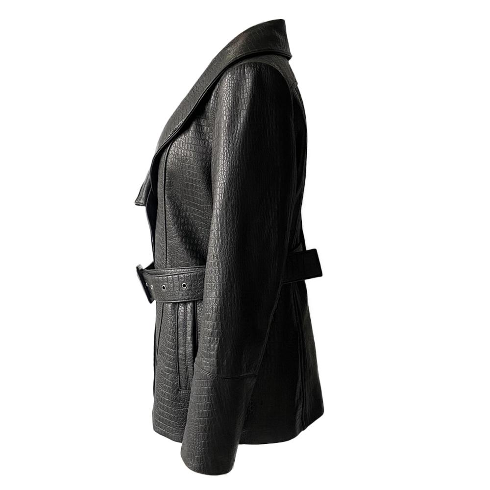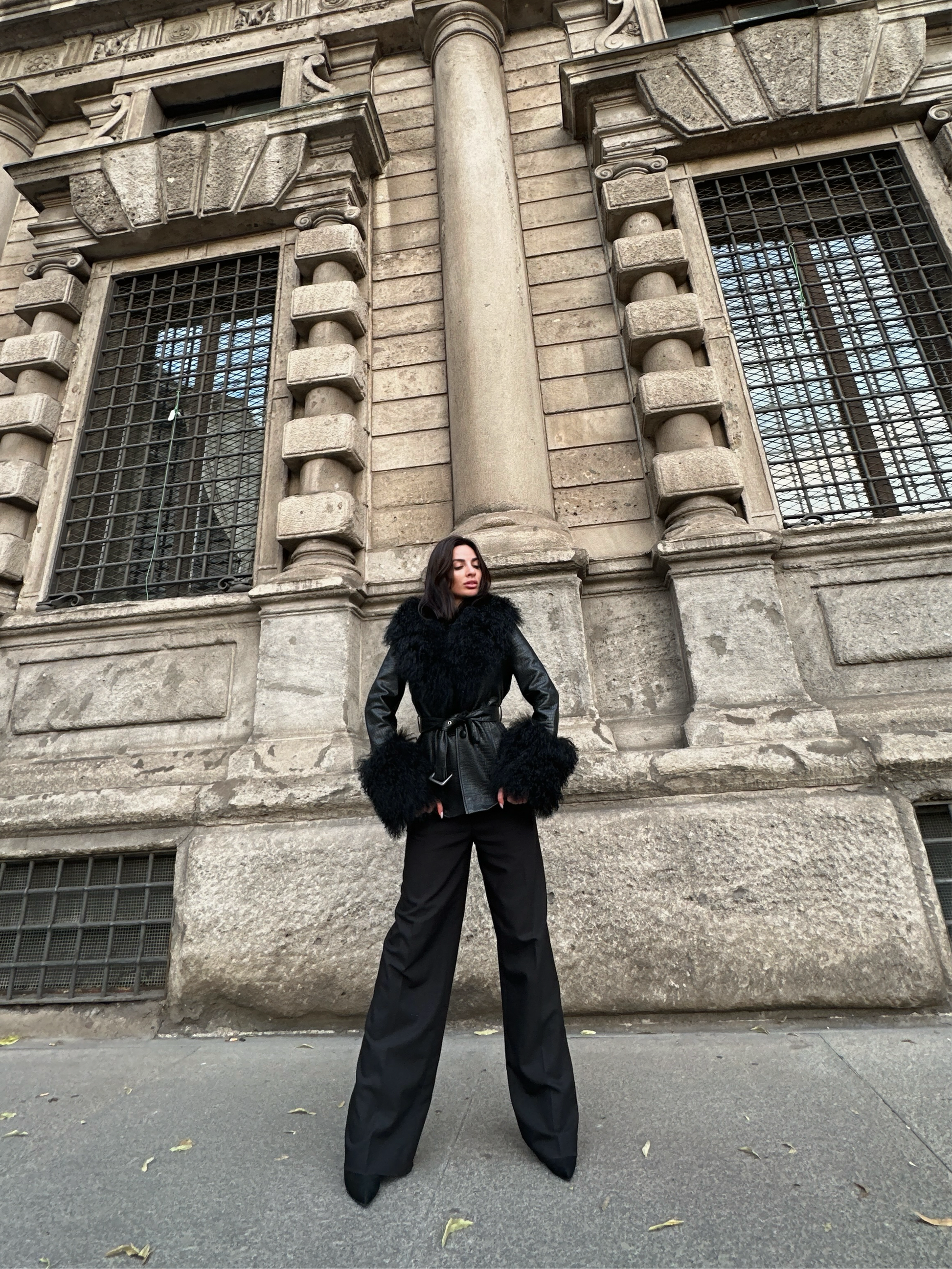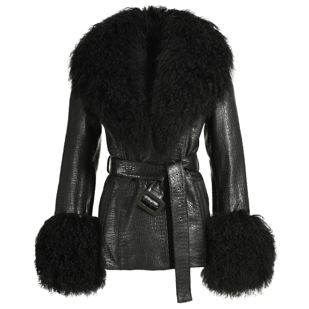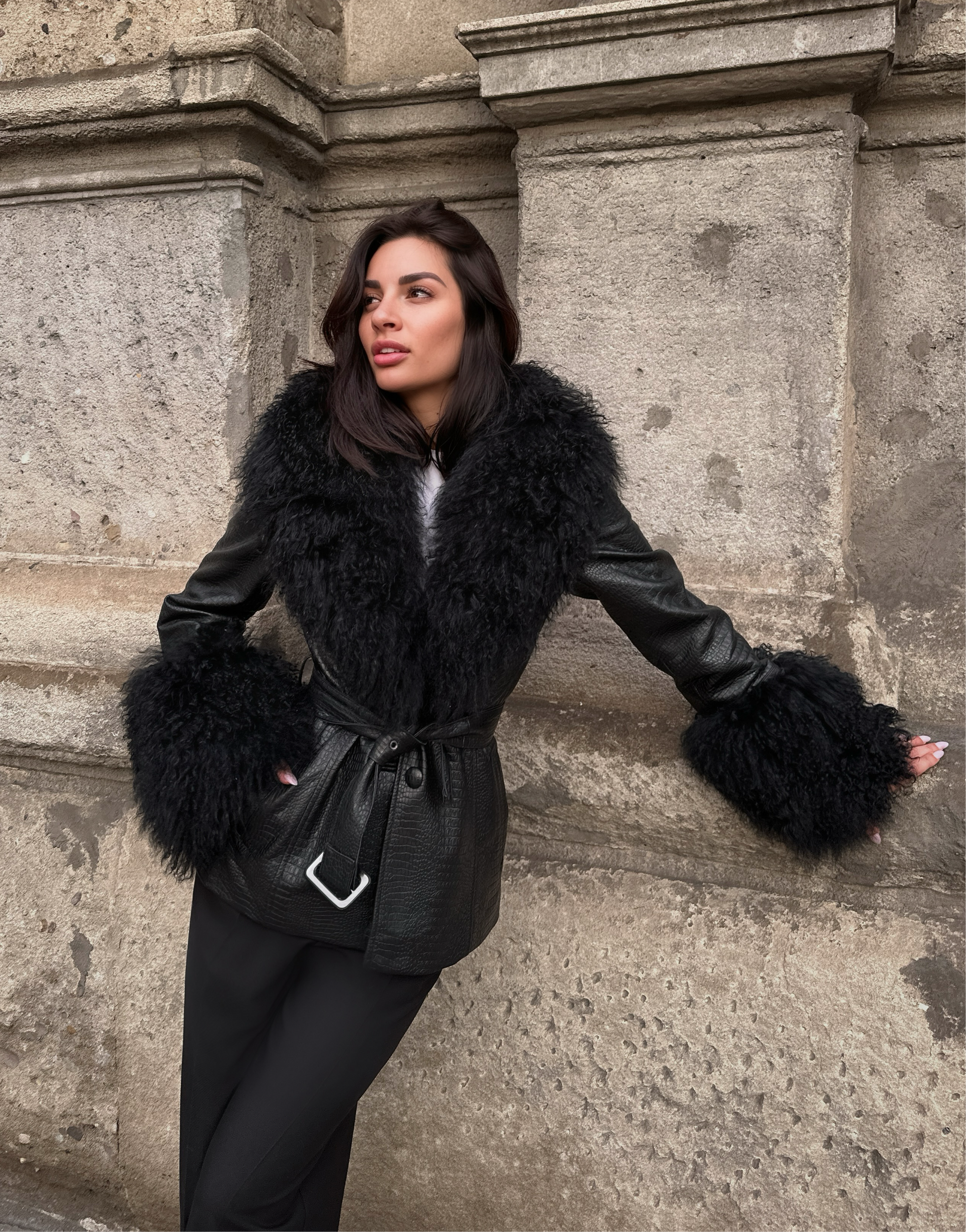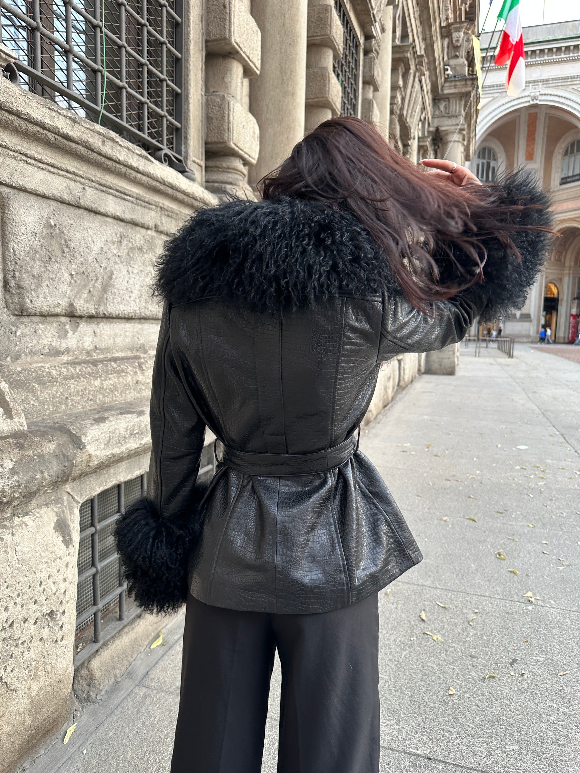 A very special soft and slightly textured croc embossed black leather. Whether you want removable trims for 2 looks or sewn in, this coat is THE MOMENT.